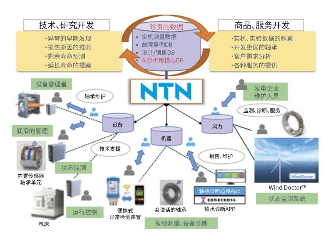 在支持人類生活活動的各種設(shè)備中,滾動軸承是組裝于其中的機械要素部件。由于機械部件的故障造成設(shè)備停止運行會導致利益損失,為了防止出現(xiàn)這些故障情況,監(jiān)測軸承周邊的溫度、振動非常重要。NTN將軸承和傳感機能融合開發(fā)了帶傳感器軸承,并且致力于提供軸承的狀態(tài)監(jiān)測服務。根據(jù)監(jiān)測到的信息,面向客戶遇到的問題,提供有效的服務和解決方案。