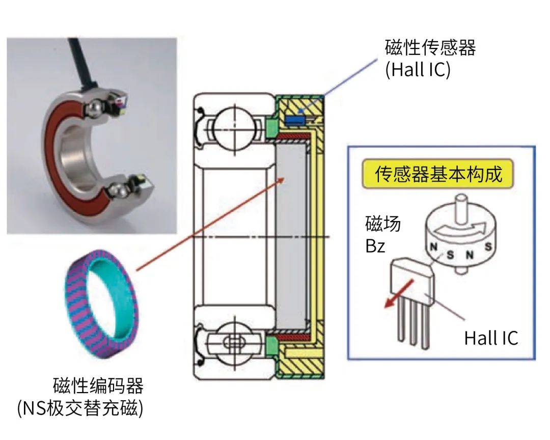 帶旋轉(zhuǎn)傳感器軸承如圖1所示,其構(gòu)造為在軸承的內(nèi)部裝入了磁性傳感器和磁性編碼器,已有標準深溝球軸承數(shù)個型號實施了產(chǎn)品系列化。由于使用了磁性傳感器,和一般的光學傳感器相比,它耐污染,也可以在高溫環(huán)境中使用。這種軸承適用于叉車上的驅(qū)動電機控制和車輪防滑控制。