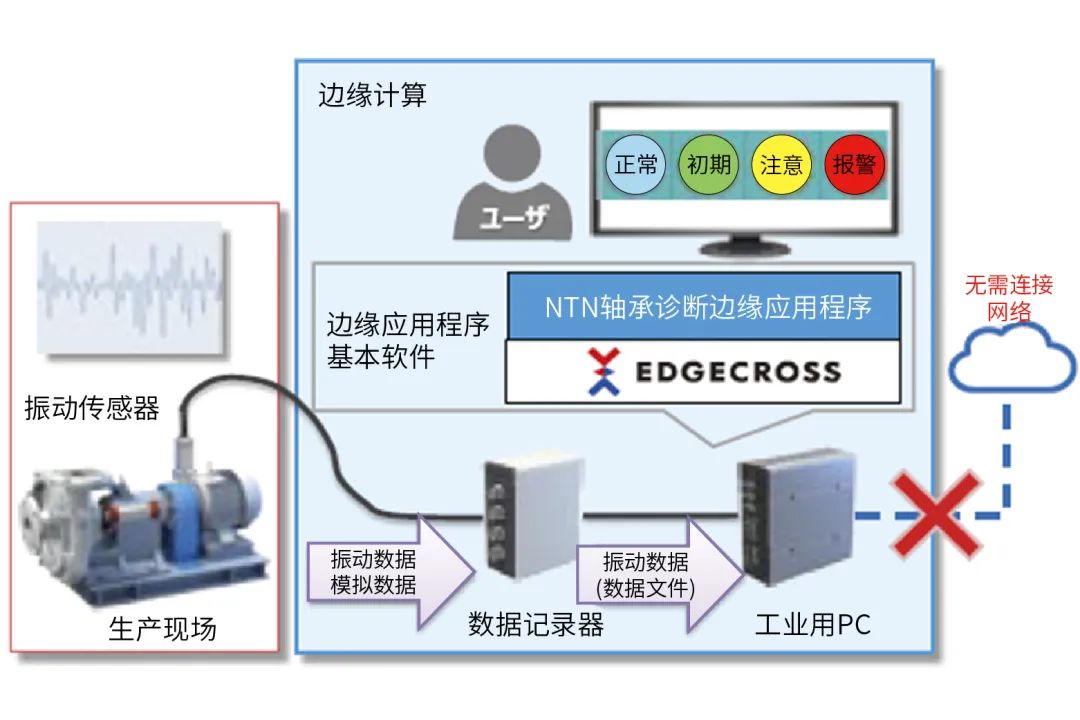 NTN在IoT平臺Edgecross6)上開發(fā)了作動軸承診斷應用程序(圖8),并提供不需要接入互聯(lián)網(wǎng),不需要進行詳細的設(shè)定便能提供狀態(tài)監(jiān)測功能7)的工具。詳情請參考相關(guān)講解報道。